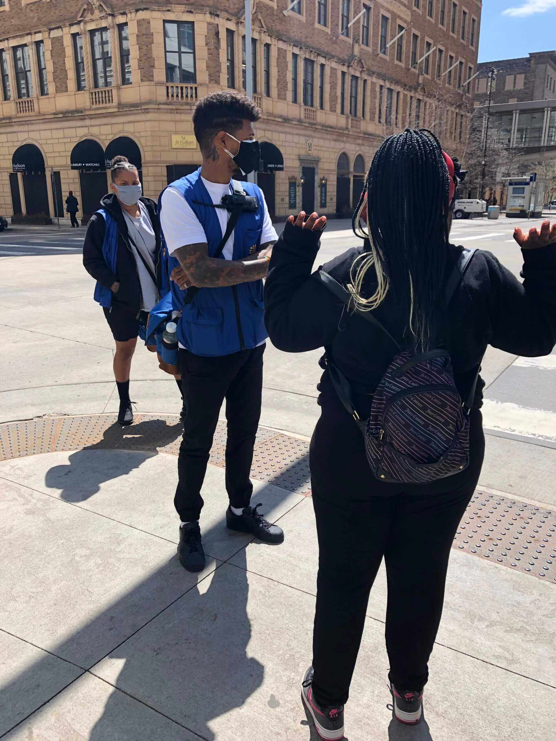 “The most common question we get is ‘Is YouthLink open today?’” says Angel Sandro, an Outreach and Opportunity Navigator who has worked at YouthLink for six years. Sporting royal blue and yellow vests with the YouthLink logo prominently displayed across the back, peer outreach team members also receive inquiries from curious adults interested in learning more about the nonprofit organization. In addition to their general presence downtown, they also receive requests to staff specific events like the Pride parade or Twins home opener and sometimes work in other areas of Minneapolis such as the Midtown Greenway.
