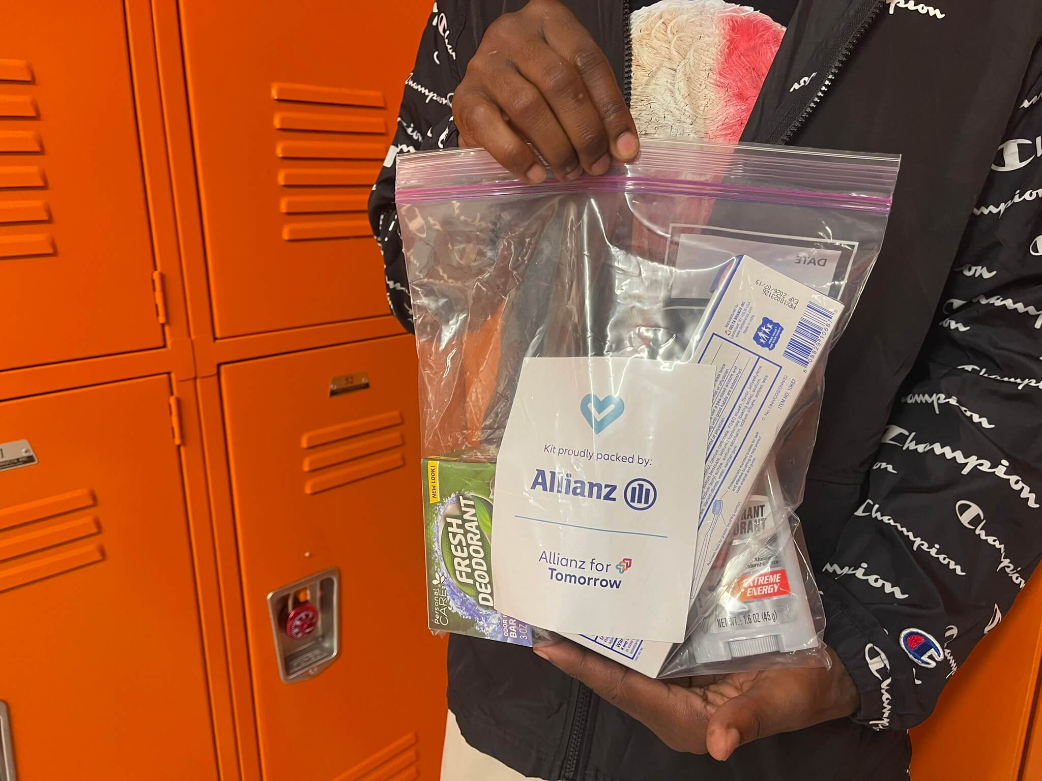 Jervase with a hygiene kit donation drop-off from Dayforce